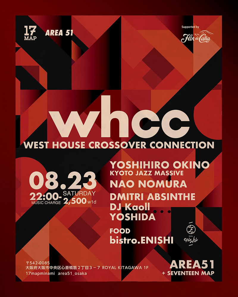 KYOTO JAZZ MASSIVEとして活動30周年を迎え、ワールドワイドに活躍を続けるYOSHIHIRO OKINOと、関西のテクノ・ハウスシーンで長く活動を続けるNAO NOMURA。長年の経験に裏打ちされた安定感と実力で信頼を集めるグルーヴ職人 DMITRI ABSINTHE、シカゴハウスやジャズ、JUKEなど多彩な音楽遍歴と鋭い審美眼を持ちシーン黎明期からJUKEを軸に活動してきたDJ Kaoll、柔軟で遊び心のあるミックスに定評があり、フロアを巧みに変化させるYOSHIDAが出演。そして、bistro.ENISHIがFOODで出店! イベントの空間に寄り添うここでしか味わえない一皿にも注目を。会場のAREA51はSEVENTEEN MAP店内の奥の扉を開けた先に現れる、赤く妖艶なシークレットルーム。 |