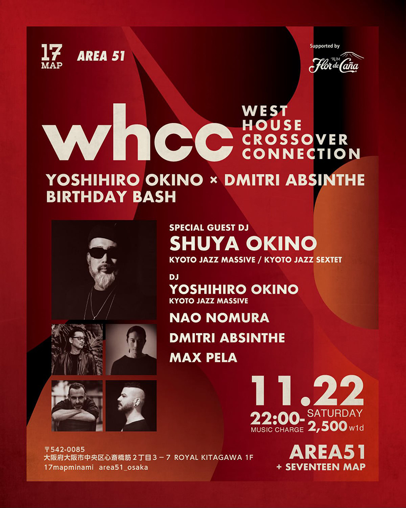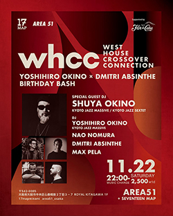 音楽プロデューサー/DJ/選曲家/作曲家/執筆家/ラジオDJ/The Roomオーナーなど多彩な顔を持ち、現在ヨーロッパではバンド活動でも注目を集める SHUYA OKINO(KYOTO JAZZ MASSIVE)、WHCCレギュラーYOSHIHIRO OKINO(KYOTO JAZZ MASSIVE)とNAO NOMURA、そして、長年のキャリアで信頼を集めるグルーヴ職人 DMITRI ABSINTHE、さらにHouse/Afro Houseシーンを牽引し、圧倒的な一体感で世界を魅了する MAX PELA が集結!